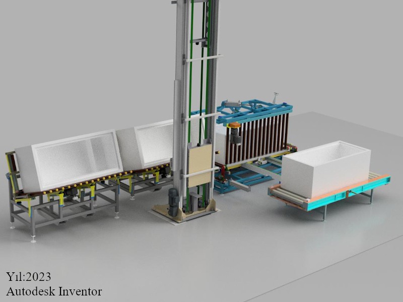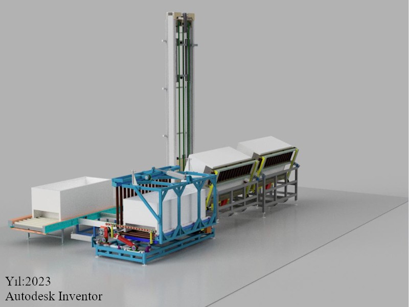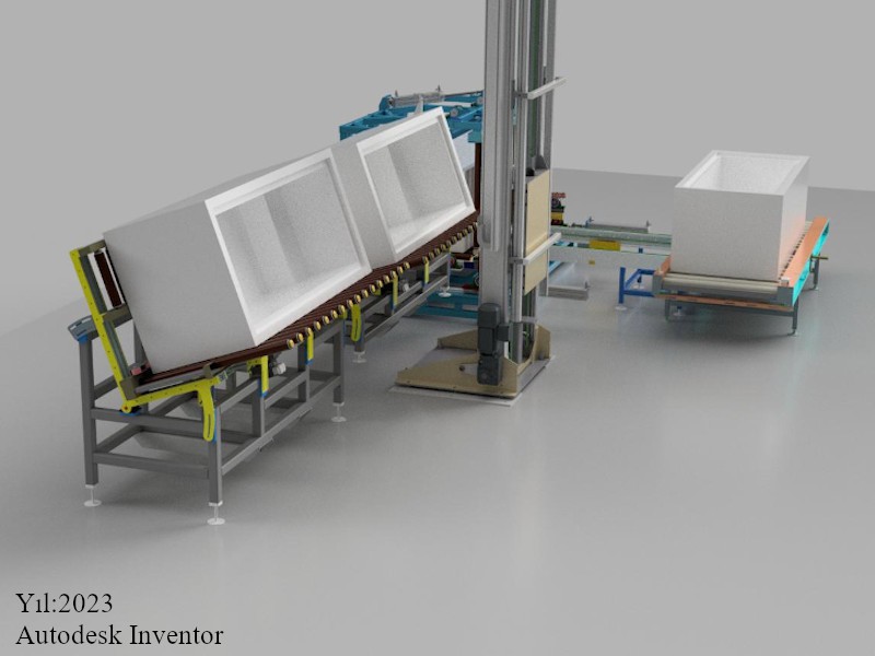 Buz dolabının fabrika içerisinde hat boyunca belirli işlemlere tabi tutulabilmesi için taşınabilmesine olanak sağlayan konveyörlü ve liftli yapıya sahip müşteri talebine göre oluşturulmuş tasarım projemizdir.