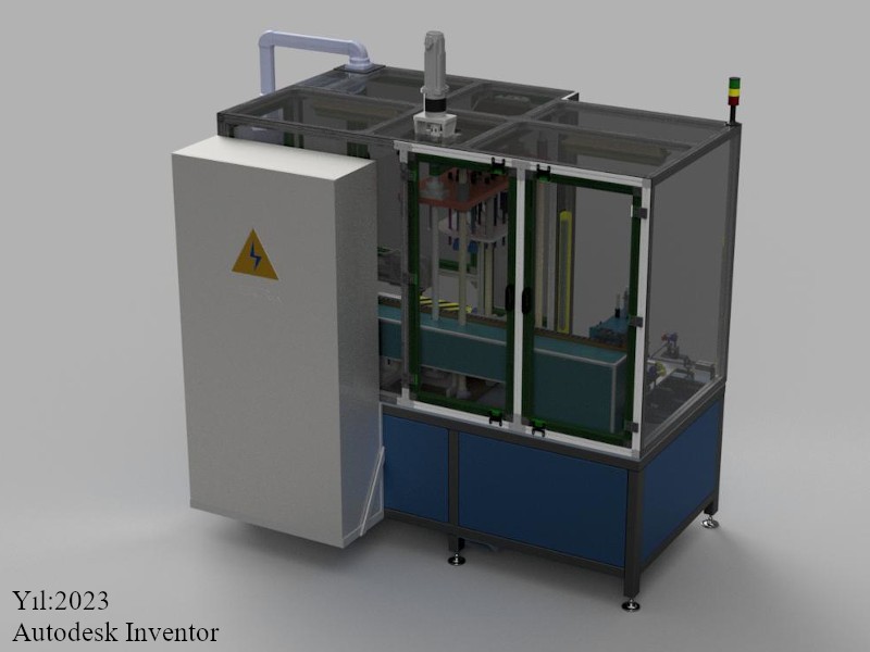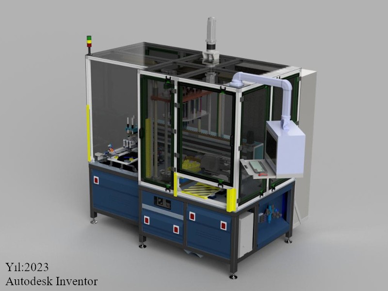 Ürününün basınçlı hava ile kaçak testinin yapıldığı aynı zamanda ürün üzerinde montajlı olması gereken parçaların sensörler ile kontrolünün yapıldığı makinaya ait tasarım projemizdir.